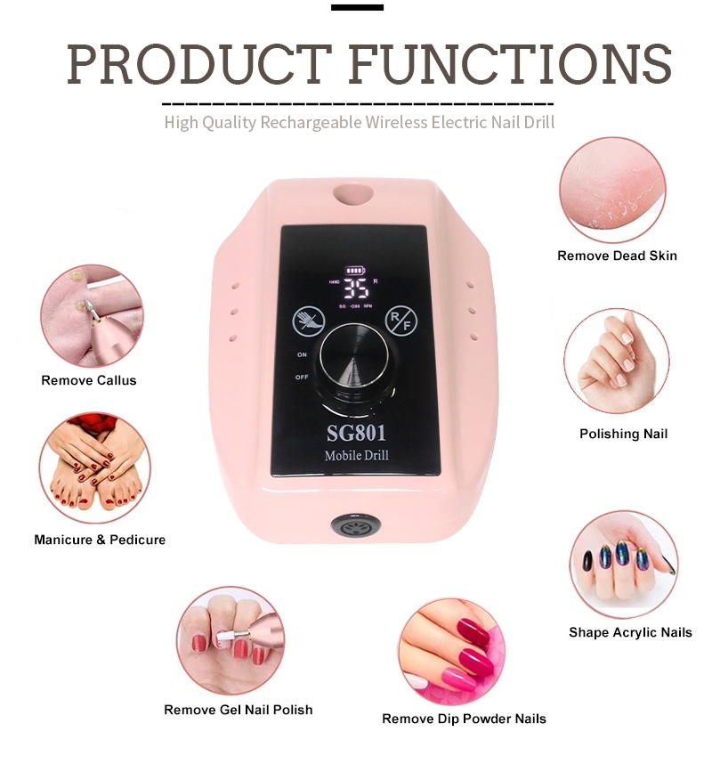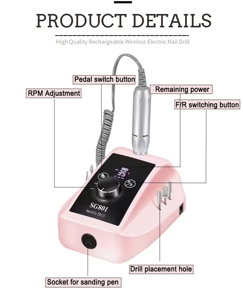 Šīs 35 000 apgr./min elektriskās pārnēsājamās gēla nagu urbjmašīnas displeja dizains ir aprīkots ar ieslēgšanas/izslēgšanas slēdzi un griešanos uz priekšu/atpakaļ ar vienu pogu, ātrās uzlādes ligzda apakšā, maināma urbja ligzda augšpusē un trīs pozīciju regulējams ātrums, lai apmierinātu dažādas vajadzības.