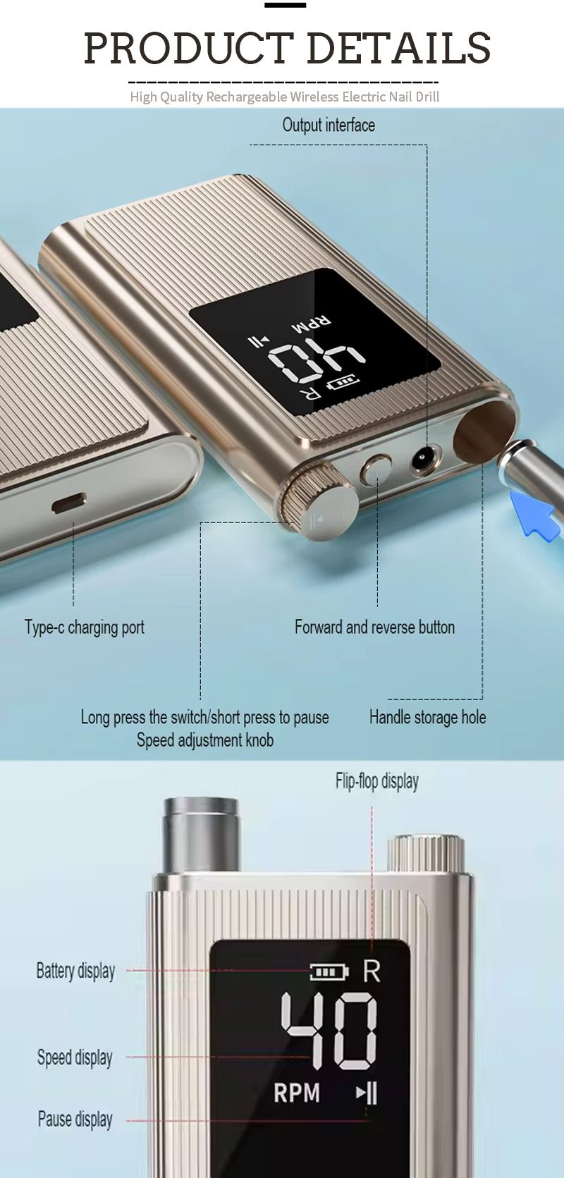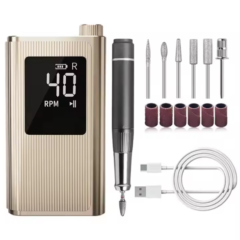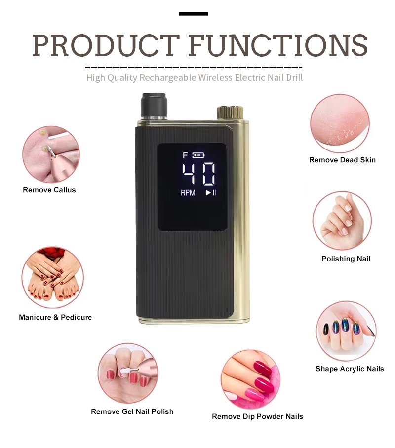 Šīs ātrgaitas profesionālās nagu urbjmašīnas ar 40 000 apgr./min displeja dizains ir aprīkots ar ieslēgšanas/izslēgšanas slēdzi un griešanos uz priekšu/atpakaļ ar vienu pogu, ātrās uzlādes ligzda apakšā, maināma urbja ligzda augšpusē un trīs pozīciju regulējams ātrums, lai apmierinātu dažādas vajadzības.