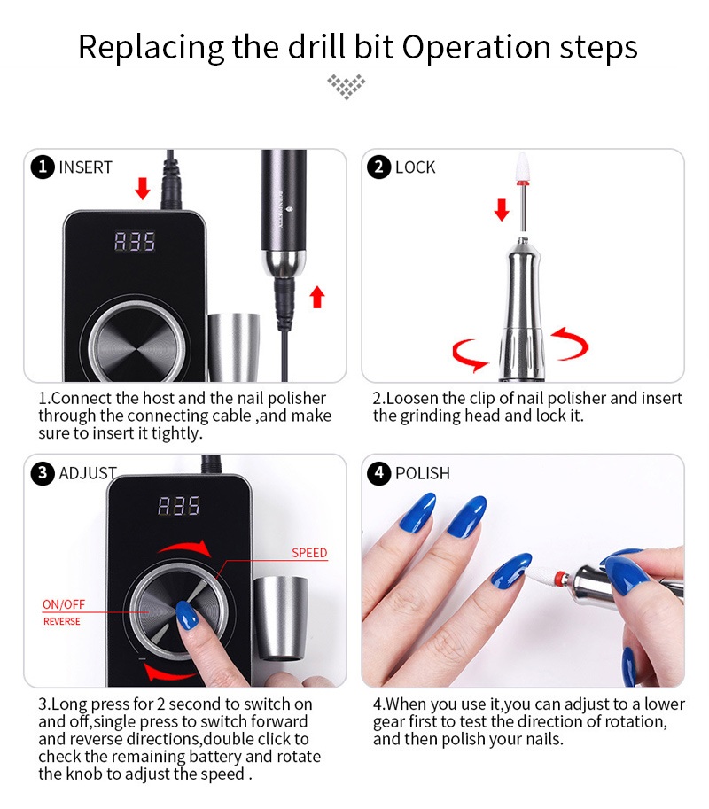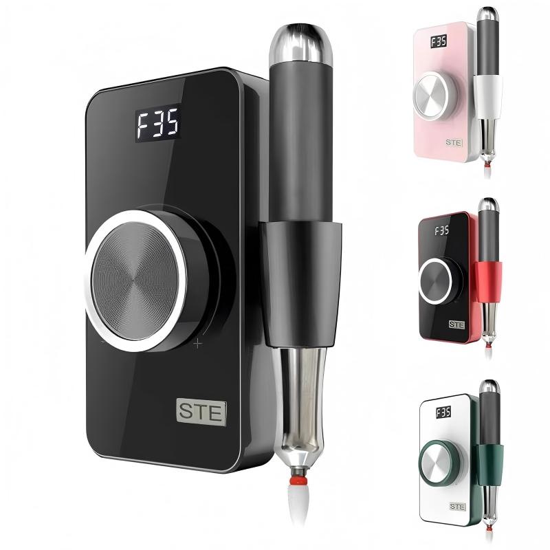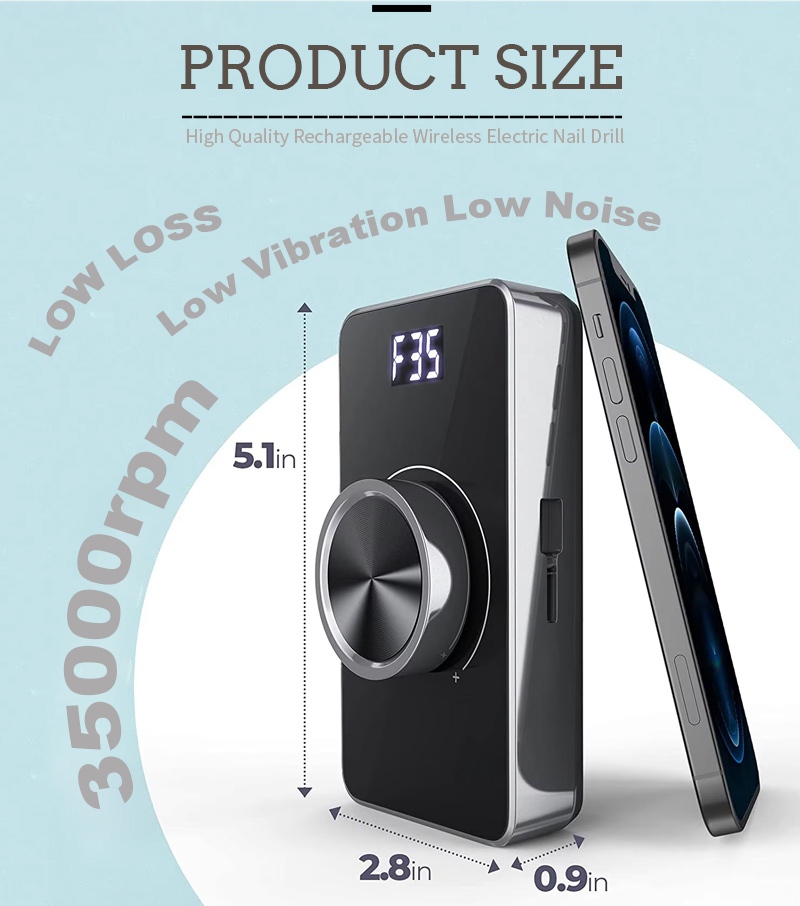 Šīs pīlinga 35 000 apgr./min elektriskās nagu urbjmašīnas displeja dizains ir aprīkots ar ieslēgšanas/izslēgšanas slēdzi un griešanos uz priekšu/atpakaļ ar vienu pogu, ātrās uzlādes ligzda apakšā, maināma urbja ligzda augšpusē un trīs pozīciju regulējams ātrums, lai apmierinātu dažādas vajadzības.