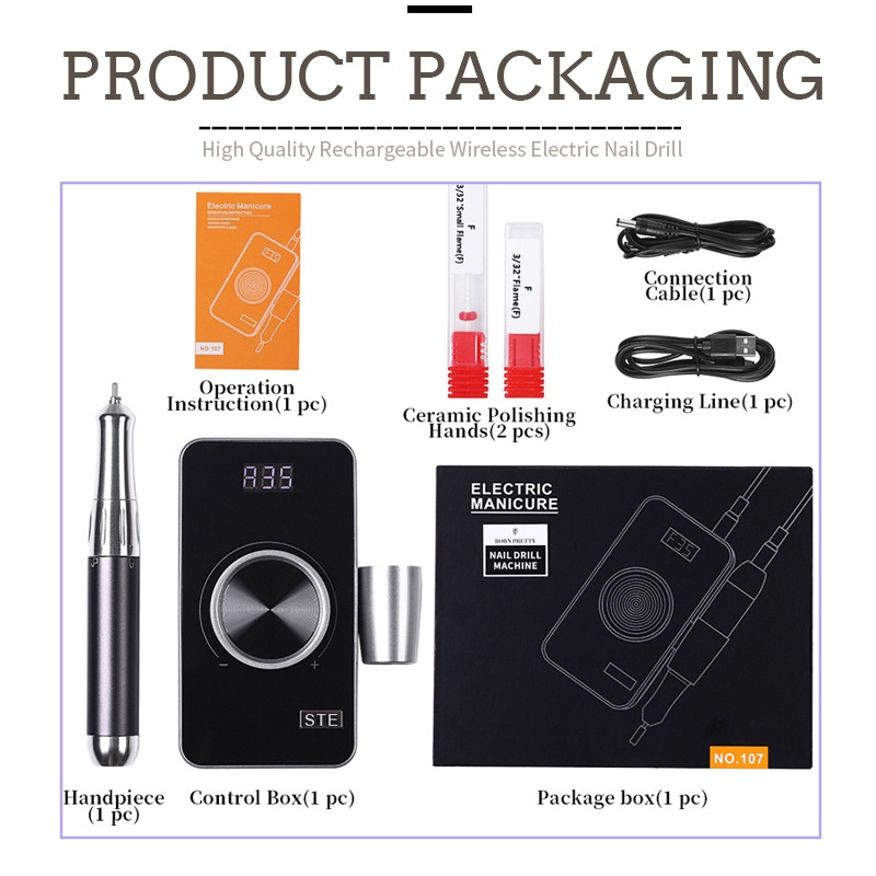 Šīs pīlinga 35 000 apgr./min elektriskās nagu urbjmašīnas iepakojuma saturs ietver slīpēšanas pildspalvu, USB uzlādes kabeli, produkta lietošanas instrukciju un vieglu un pārnēsājamu kastīti.