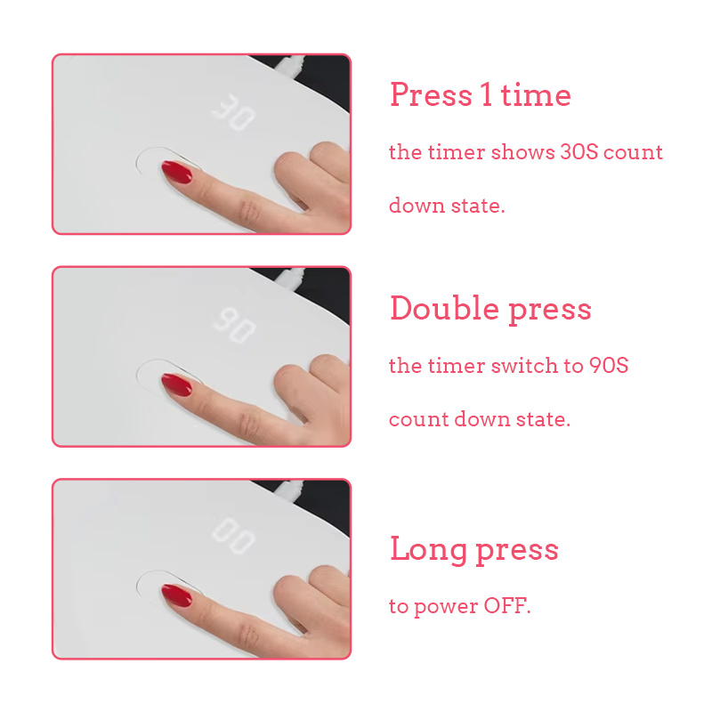 Salokāmā mini nagu žāvēšanas lampa ir aprīkota ar infrasarkano viedo sensoru tehnoloģiju, kas automātiski iedegas, kad rokas tuvojas, un izslēdzas, kad rokas attālinās, tādējādi novēršot problēmu ar atkārtotu pogu nospiešanu un ietaupot laiku un pūles. Lieljaudas līme cepšanai neprasa ilgu gaidīšanu, ietaupot gan laiku, gan pūles.
