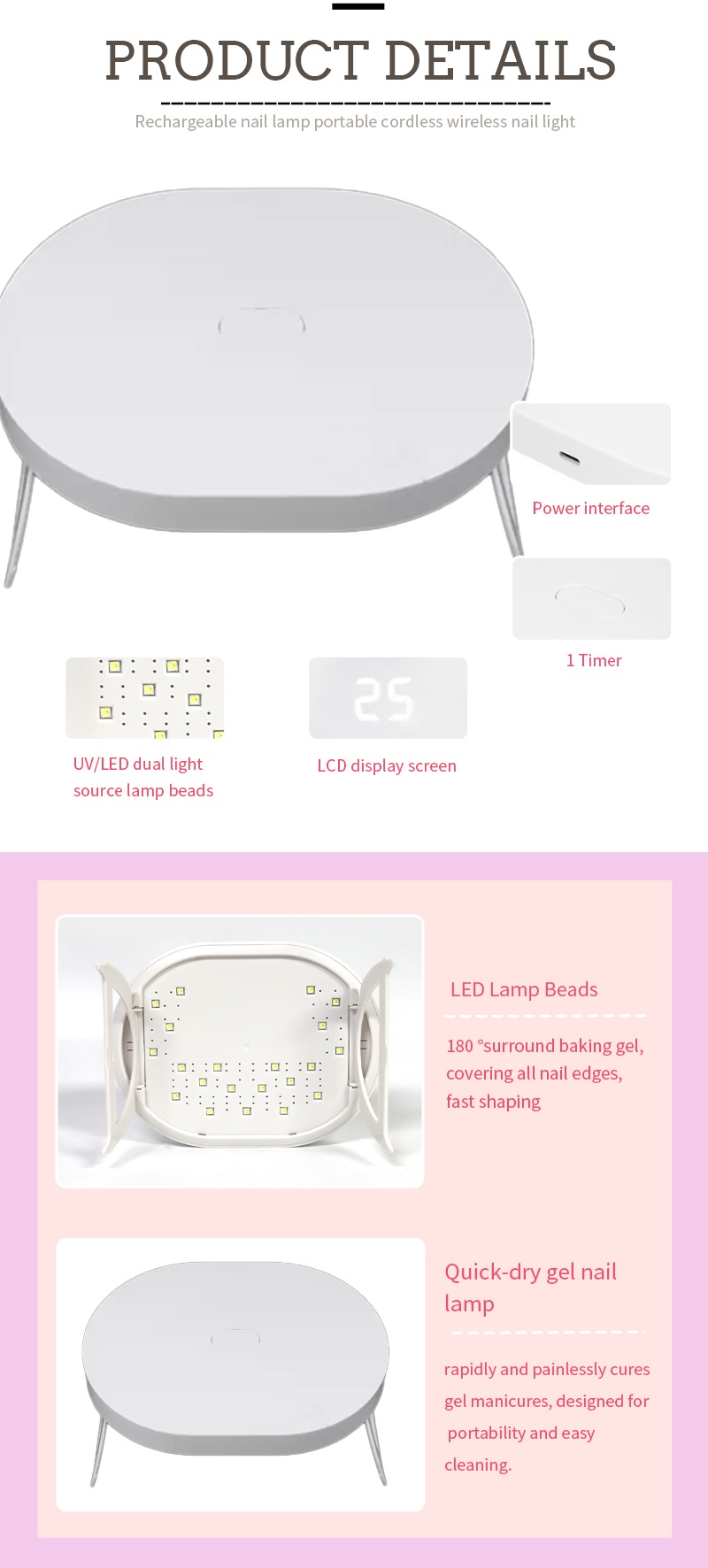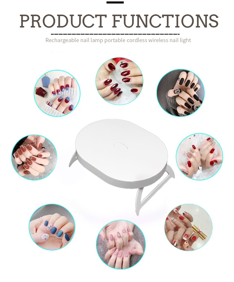 Salokāmā mini nagu žāvēšanas lampa nodrošina vienmērīgu līmes žūšanu bez saraušanās. Tā dubultie gaismas avoti nodrošina maigu sildīšanu, lai novērstu roku krāsas maiņu un acu nogurumu, piemērots gan rokām, gan kājām, nodrošinot izcili ātrus žāvēšanas rezultātus.