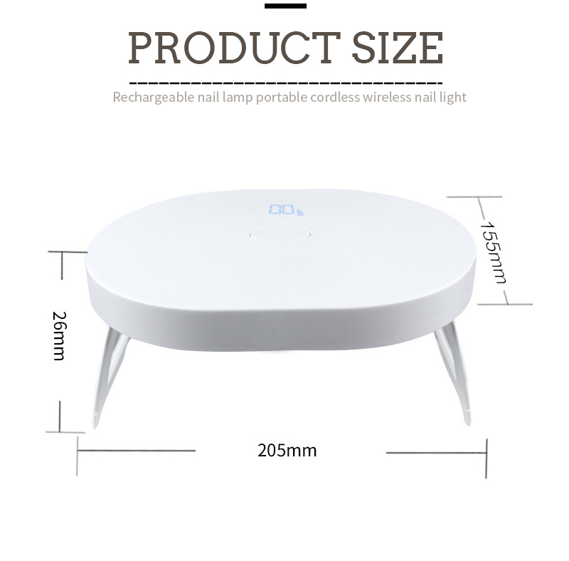 Salokāmās mini nagu žāvēšanas lampas izmēri ir 205 mm garumā, 155 mm platumā un 26 mm augstumā, ar lielu ietilpību un iespēju izmantot gan rokas, gan kājas, kas ir ļoti ērti.