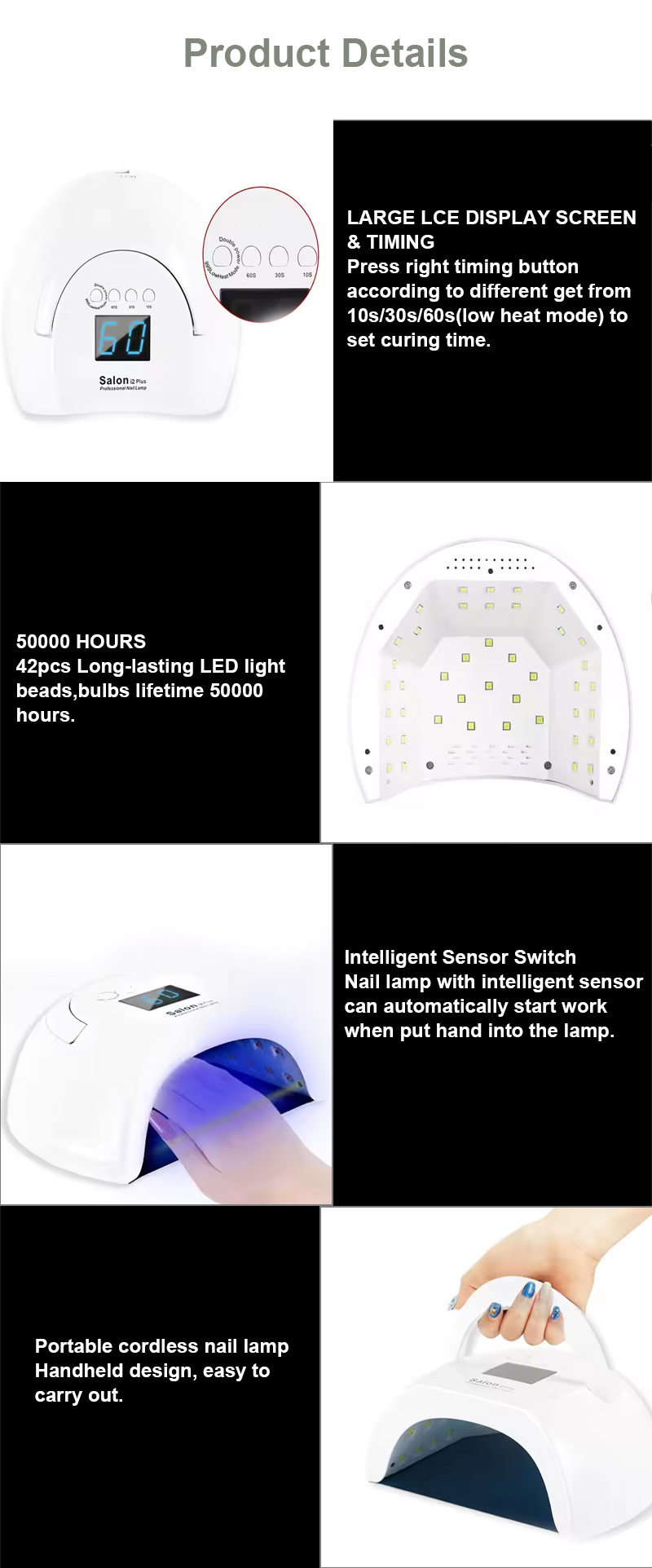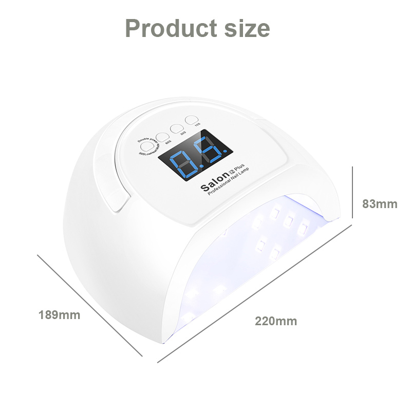 Produkts nodrošina vienmērīgu līmes žūšanu bez saraušanās. Tā dubultie gaismas avoti nodrošina maigu sildīšanu, lai novērstu roku krāsas maiņu un acu nogurumu, piemērots gan rokām, gan kājām, nodrošinot izcili ātrus žāvēšanas rezultātus.