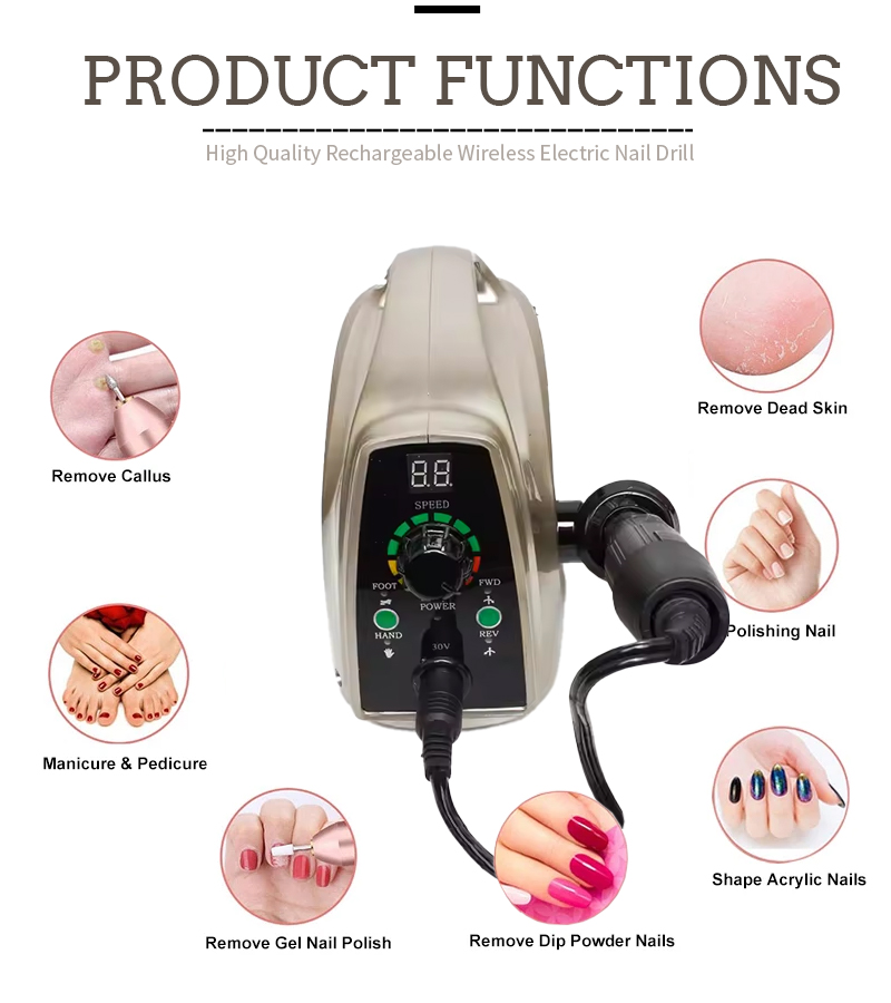 Produkta īpašības un DM-014A ātrgaitas 35 000 apgriezienu skaita elektriskā nagu fails nagu lakas noņemšanai
