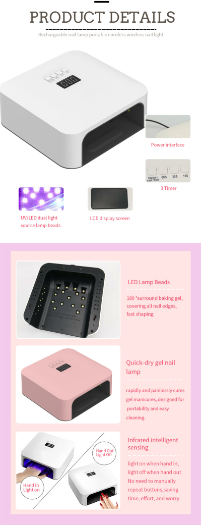 Augstas kvalitātes ātrās nagu žāvēšanas lampa ir aprīkota ar infrasarkano viedo sensoru tehnoloģiju, kas automātiski iedegas, kad rokas tuvojas, un izslēdzas, kad rokas attālinās, tādējādi novēršot problēmu ar atkārtotu pogu nospiešanu un ietaupot laiku un pūles. Lieljaudas līme cepšanai neprasa ilgu gaidīšanu, ietaupot gan laiku, gan pūles.
