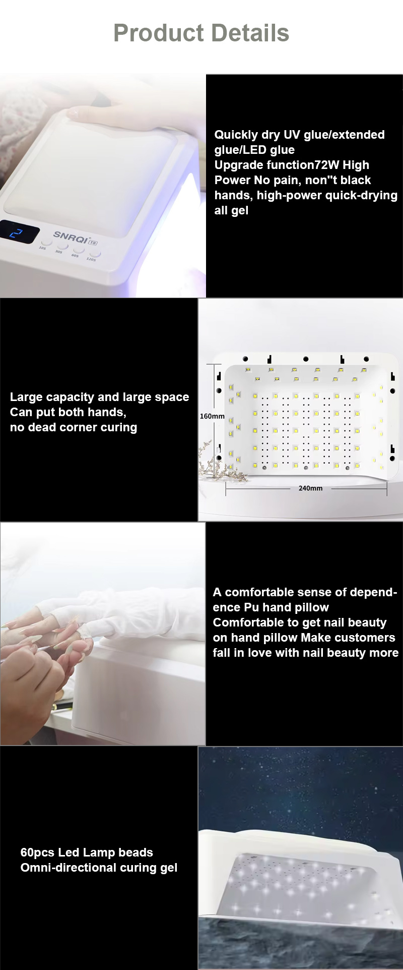 Produkts nodrošina vienmērīgu līmes žūšanu bez saraušanās. Tā dubultie gaismas avoti nodrošina maigu sildīšanu, lai novērstu roku krāsas maiņu un acu nogurumu, piemērots gan rokām, gan kājām, nodrošinot izcili ātrus žāvēšanas rezultātus.