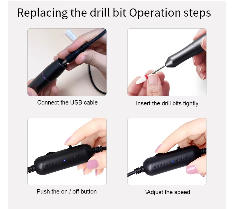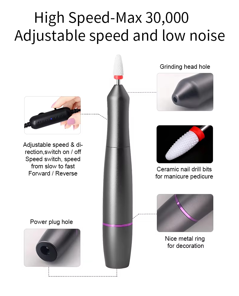 Produkta iezīme un zema trokšņa līmeņa pildspalvas formas nagu mākslas urbja pielietojums