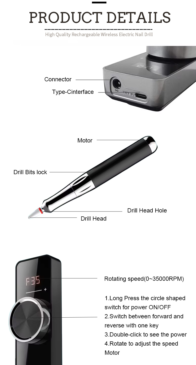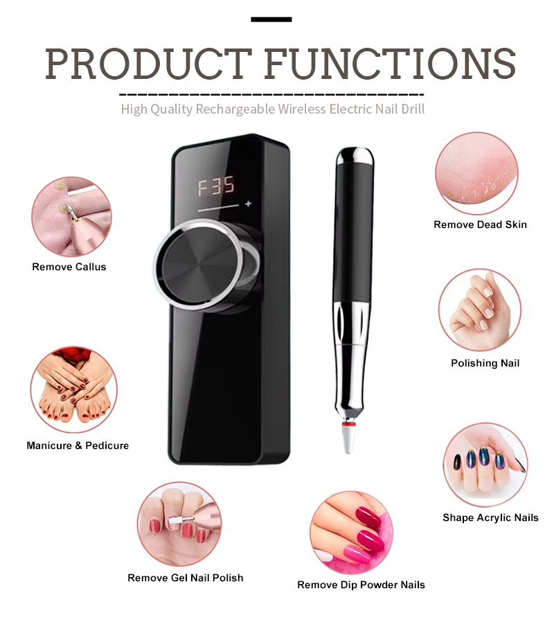 Pārnēsājams nagu urbjmašīnu komplekts elektrisks ar jaudīgu motoru 65w 35000rpm