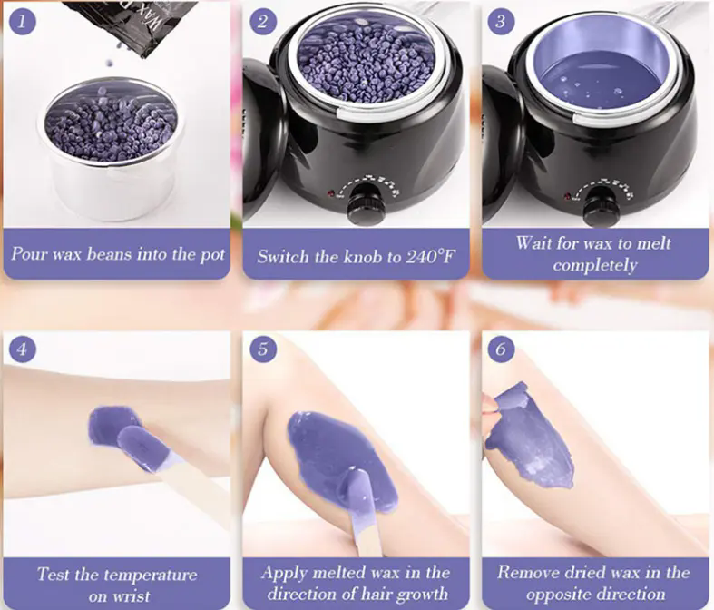 Produkta depilācijas vaska darbības metode, jo augstāka temperatūra, jo ātrāk vasks kūst, jo zemāka temperatūra, lēnāks vasks kūst, vispirms ielej atbilstošajā depilācijas vaska pupiņu daudzumā, sildot, līdz vaska pupiņas izkausē, pēc tam vienveidīgi pārklāta depilācijas vaska depilācijas daļas un visbeidzot pret matu augšanas virzienu noplēš.