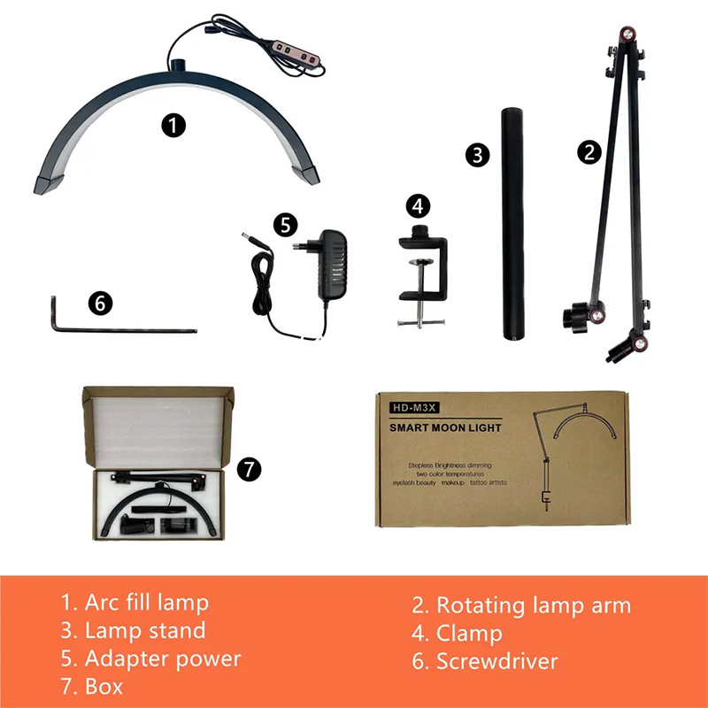 Produktu iepakojuma sarakstā ir pamatne, pusmēness loka abažūrs, savienojuma kabelis, regulēšanas poga, barošanas avots, kronšteina caurule.