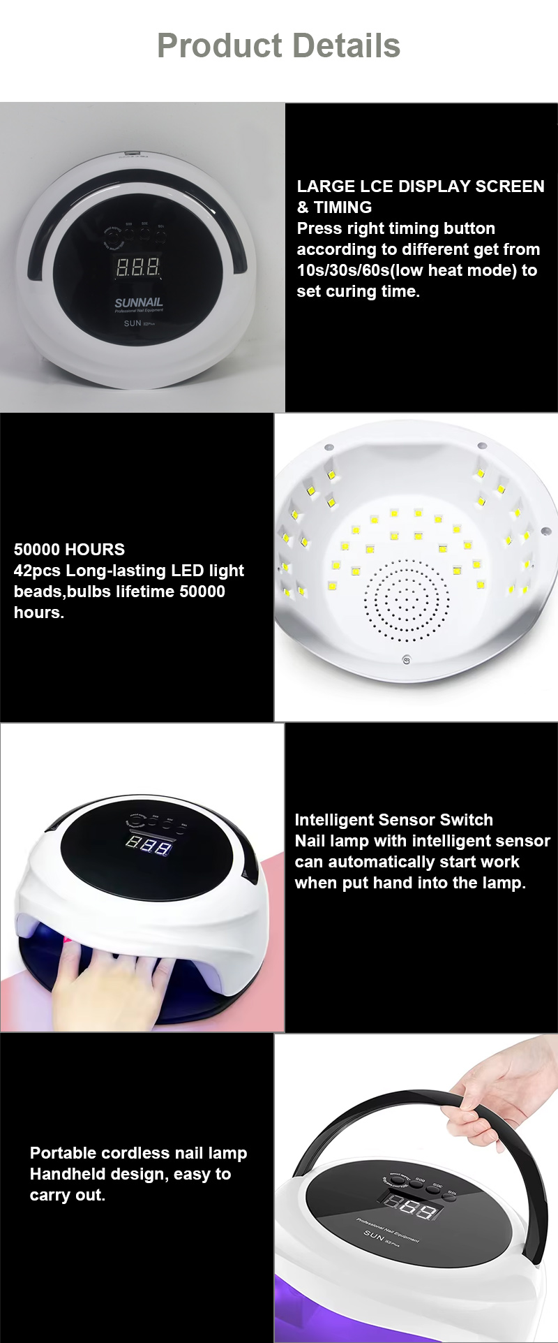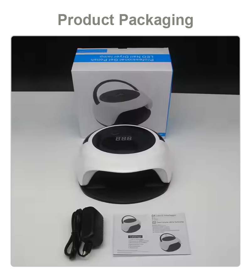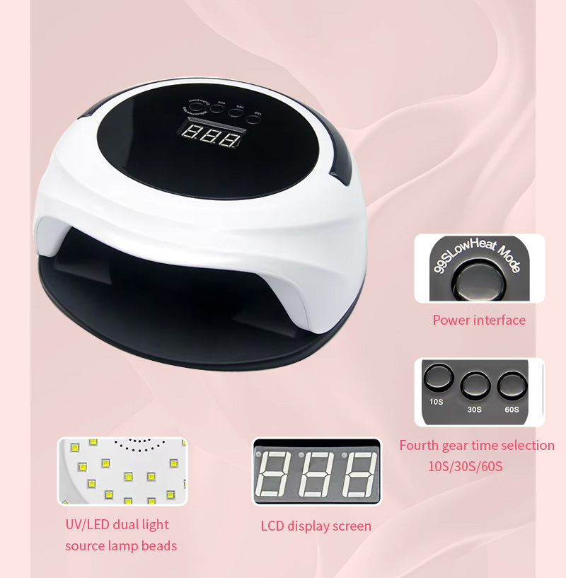 Nagu žāvēšanas lampa ar automātisko sensora funkciju nodrošina vienmērīgu līmes žūšanu bez saraušanās. Tā dubultie gaismas avoti nodrošina maigu sildīšanu, lai novērstu roku krāsas maiņu un acu nogurumu, piemērots gan rokām, gan kājām, nodrošinot izcili ātrus žāvēšanas rezultātus.