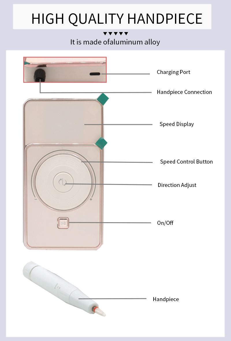 Šis ātrgaitas zema trokšņa līmeņa slīpēšanas pildspalvas displeja dizains, ar slīpēšanas pildspalvas ligzdu, LCD šķidro kristālu displejs var parādīt apgriezienu skaitu/jaudu/virzienu, ātruma slēdža pogu, pulksteņrādītāja kustības virzienam/pretēji pulksteņrādītāja virzienam pārslēgšanas pogu, pauzes pogu, 30 000 apgr./min profesionālu motoru, ieskrūvējamu bloķēšanas slīpēšanas galvu.