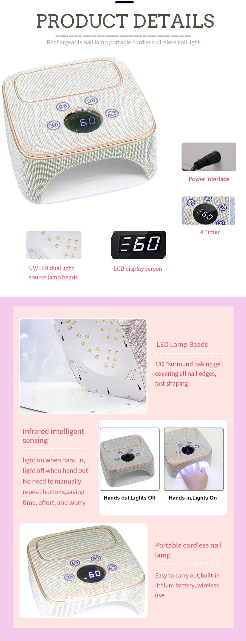 Uzlādējama nagu lakas lampas profesionālās versijas 90W produkta izskats ir rievu dizains, rokturi rievā var izmantot kā pārnēsājamu roktura lomu, padarot to ērtāku nēsāšanai un ievietošanai. Tas arī ļauj izvairīties no tā, cik neizdevīgi rokturis ir viegli salauzts un novilkts.