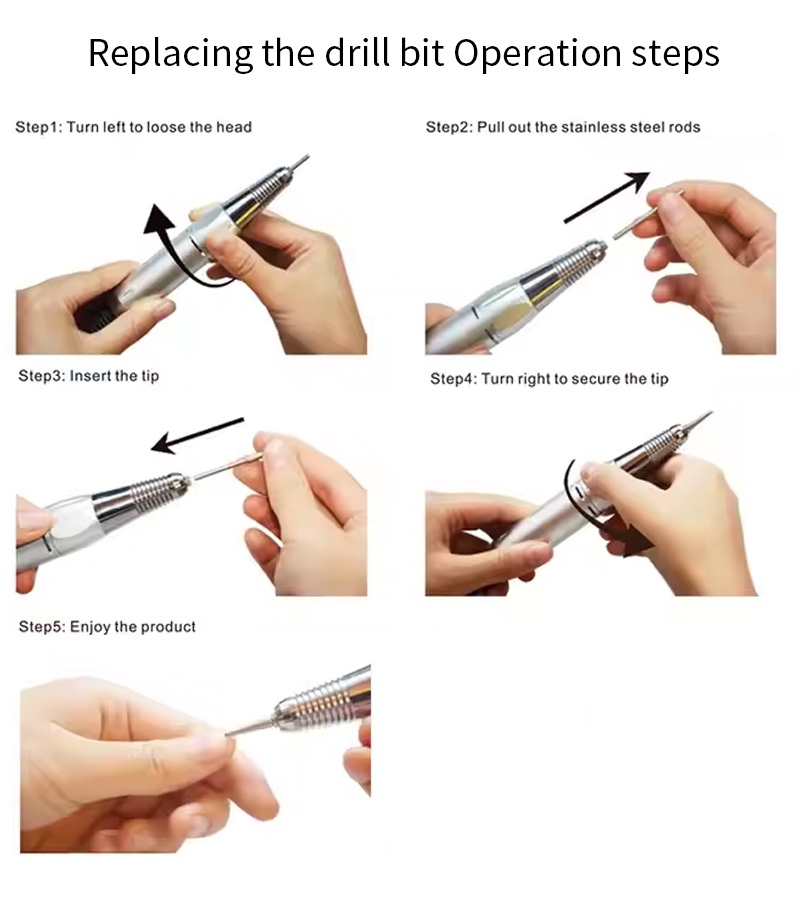 Šī profesionālā pārnēsājamā nagu urbjmašīna ar 35 000 apgr./min nomaiņas urbjmašīnas darbības metodi, tas ir, pievienojiet un izvelciet, viegli un ērti, nomaiņu var izmantot pēc pabeigšanas.