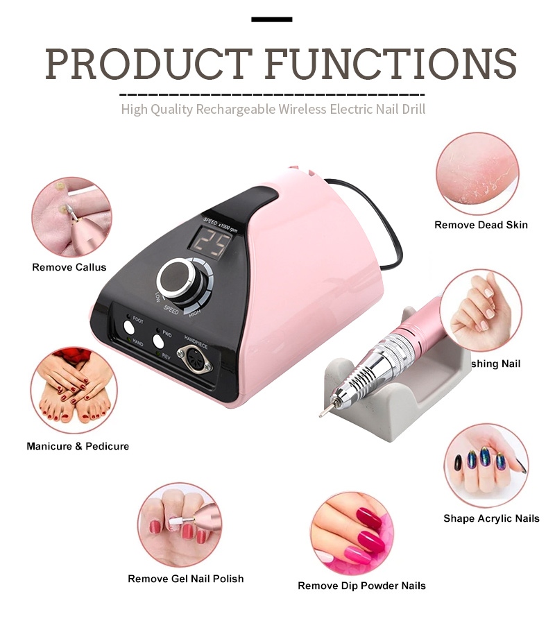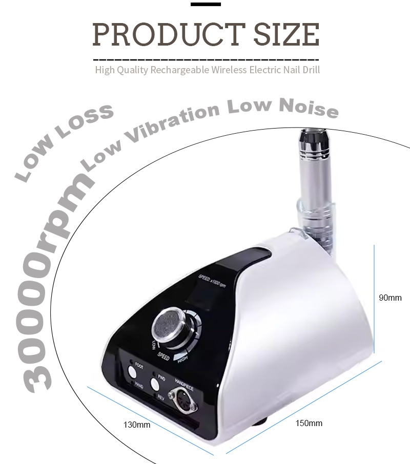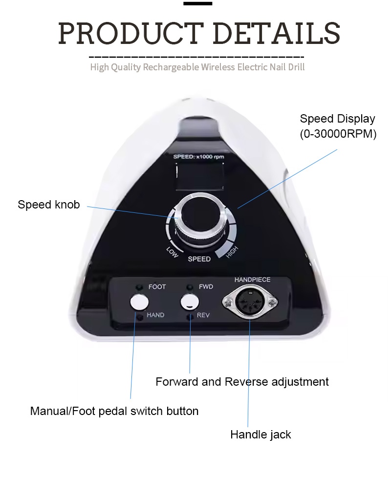 Šīs profesionālās pārnēsājamās nagu urbjmašīnas displeja dizains ar 35 000 apgr./min ir ieslēgšanas/izslēgšanas slēdzis un rotācija uz priekšu/atpakaļ, lai aktivizētu kopā ar vienu pogu, ātrās uzlādes ligzda apakšā, maināma urbja ligzda augšpusē un trīs pozīciju regulējams ātrums, lai apmierinātu dažādas vajadzības.