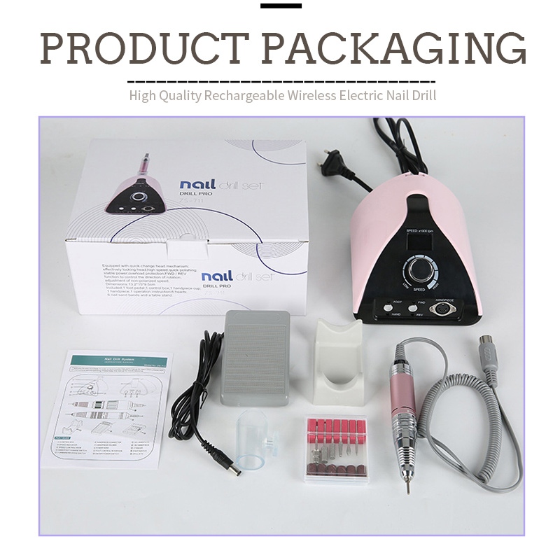 Šīs profesionālās pārnēsājamās nagu urbjmašīnas 35 000 apgr./min iepakojumā ir iekļauts slīpēšanas pildspalvas izstrādājums, USB uzlādes kabelis, izstrādājuma lietošanas instrukcija un viegla un pārnēsājama kaste.