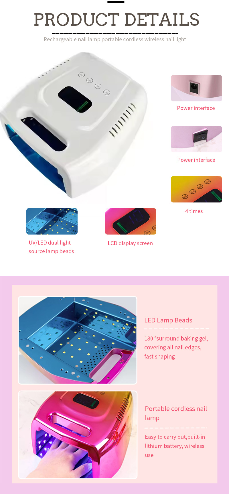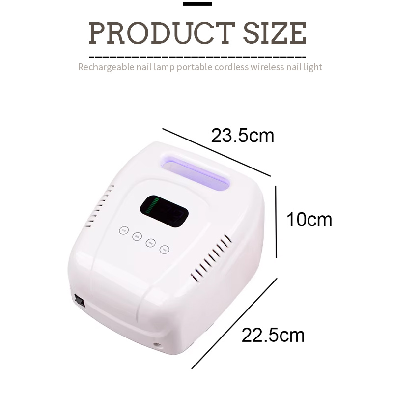 Uzlādējama nagu lakas lampas profesionālās versijas 160W produkta izskats ir rievu dizains, rokturi rievā var izmantot kā pārnēsājamu roktura lomu, padarot to ērtāku nēsāšanai un ievietošanai. Tas arī ļauj izvairīties no tā, cik neizdevīgi rokturis ir viegli salauzts un novilkts.