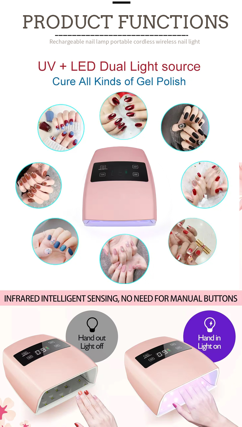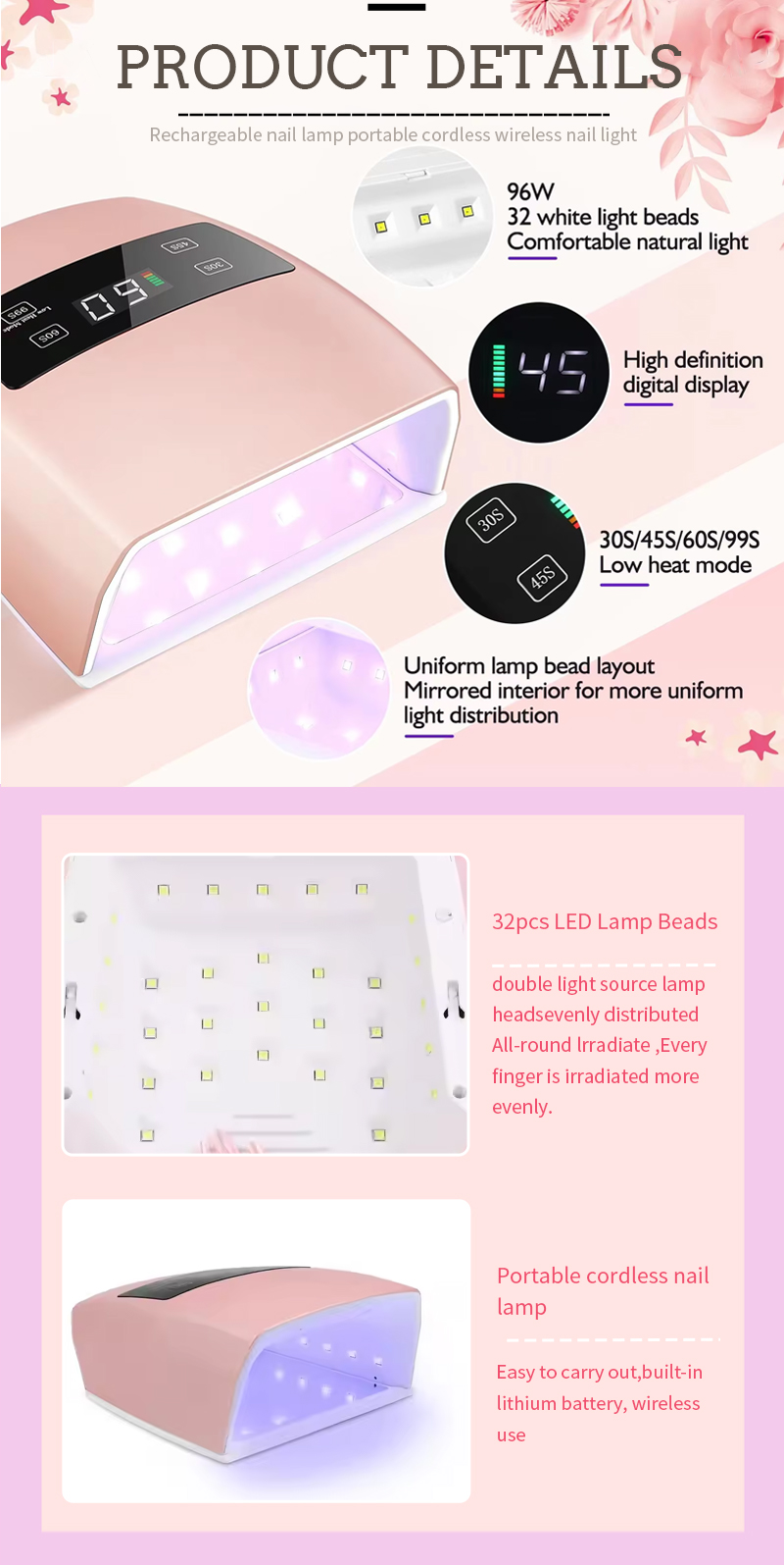 Produkts nodrošina vienmērīgu līmes žūšanu bez saraušanās. Tā dubultie gaismas avoti nodrošina maigu sildīšanu, lai novērstu roku krāsas maiņu un acu nogurumu, piemērots gan rokām, gan kājām, nodrošinot izcili ātrus žāvēšanas rezultātus.