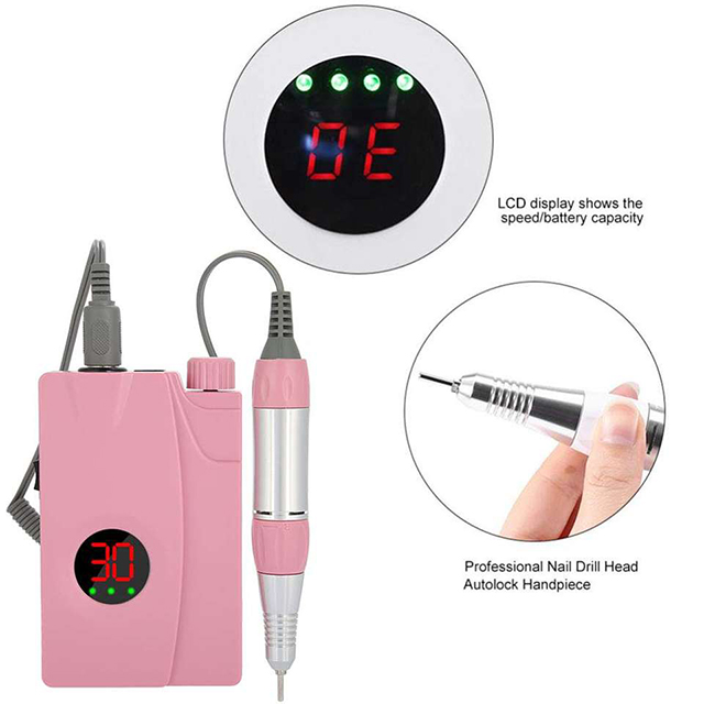 Produkta iezīme un uzlādējamā nagu urbjmašīnas komplekta rozā pielietojums ar turētāju 25w 30000rpm