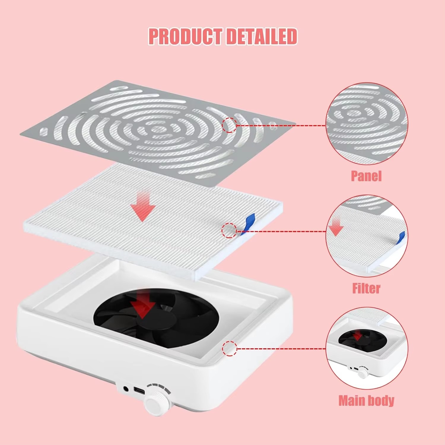 2)Produkta precizitātes filtri efektīvi filtrē dažādas nagu putekļu atmirušās ādas un citus piemaisījumus, blīvi filtri neizplatās putekļu spēju adsorbciju.