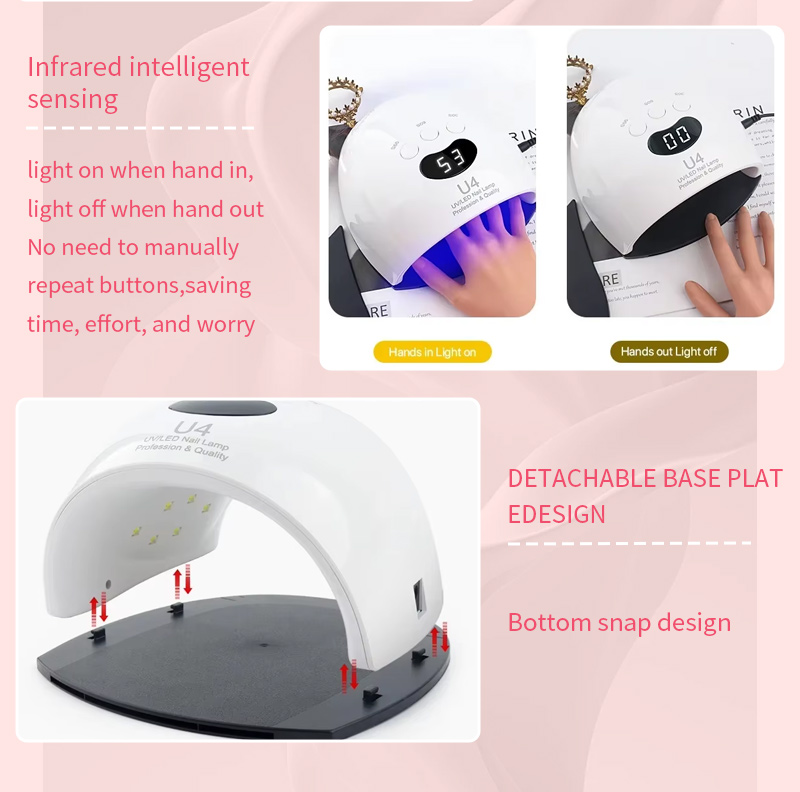3)Uzlādējamā nagu žāvētāja lampa bezvada bez sirds formas 72W ir noņemama Snap struktūras apakšējā plāksne, vienkārši jānospiež atpakaļ, to var noņemt, ērti iekšējiem tīrīšanas traipiem.