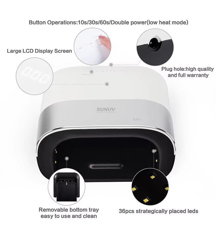 1)Uzlādējama nagu salona UV žāvētājs 48W produkta pamatplate ir noņemama dizaina, noņemama pamatnes plāksne, lai ērti notīrītu, ļoti ērtu un viegli noņemtu pamatplāksni un uzstādītu pamatnes plāksni.
