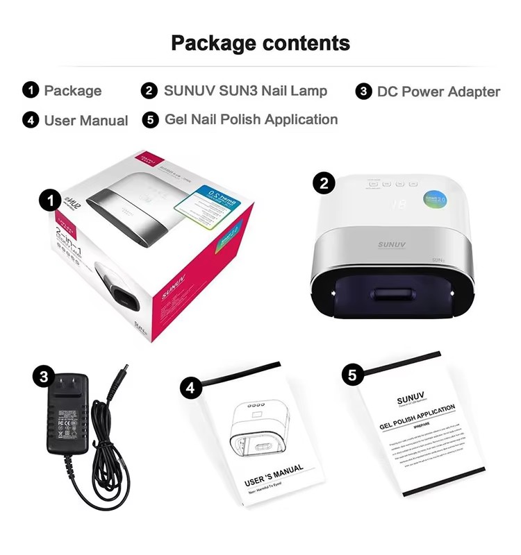 1)Uzlādējama nagu salona UV gaismas žāvētāja 48W produktu pakete ir ar manuālu, lādētāja spraudni, lādēšanas kabeli, nagu lampu.