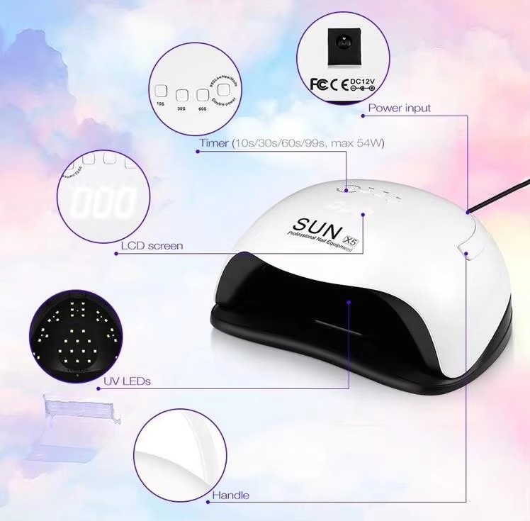 3)Uzlādējama nagu lakas lampa 54 vatu uzlādējama produkta virsmas displeja dizains. Ir laika taimera režīms attiecīgi 10s/30s/60s iestatīšanas pogas.