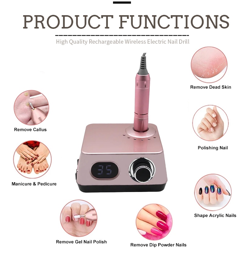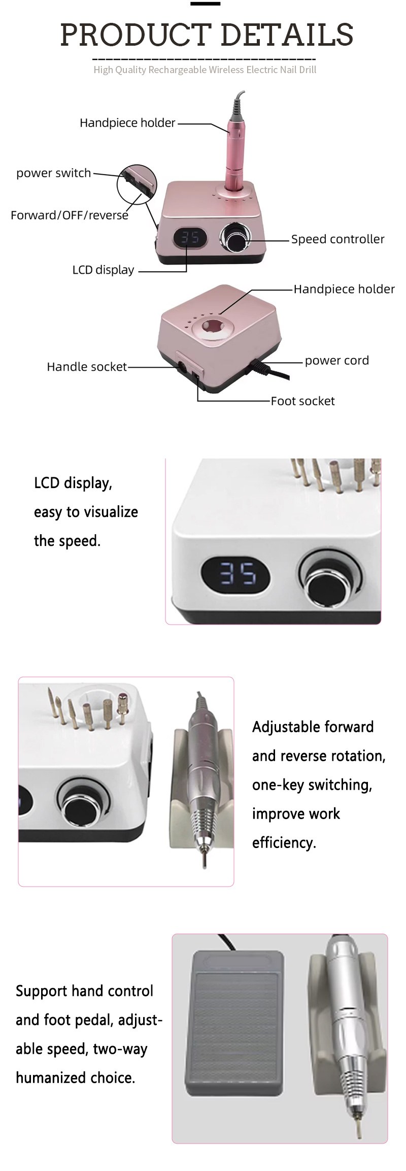 Šīs bezvadu elektriskās nagu urbjmašīnas displeja dizains ar 35 000 apgr./min ir aprīkots ar ieslēgšanas/izslēgšanas slēdzi un griešanos uz priekšu/atpakaļ, lai aktivizētu kopā ar vienu pogu, ātrās uzlādes ligzda apakšā, maināma urbja ligzda augšpusē un trīs pozīciju regulējams ātrums, lai apmierinātu dažādas vajadzības.